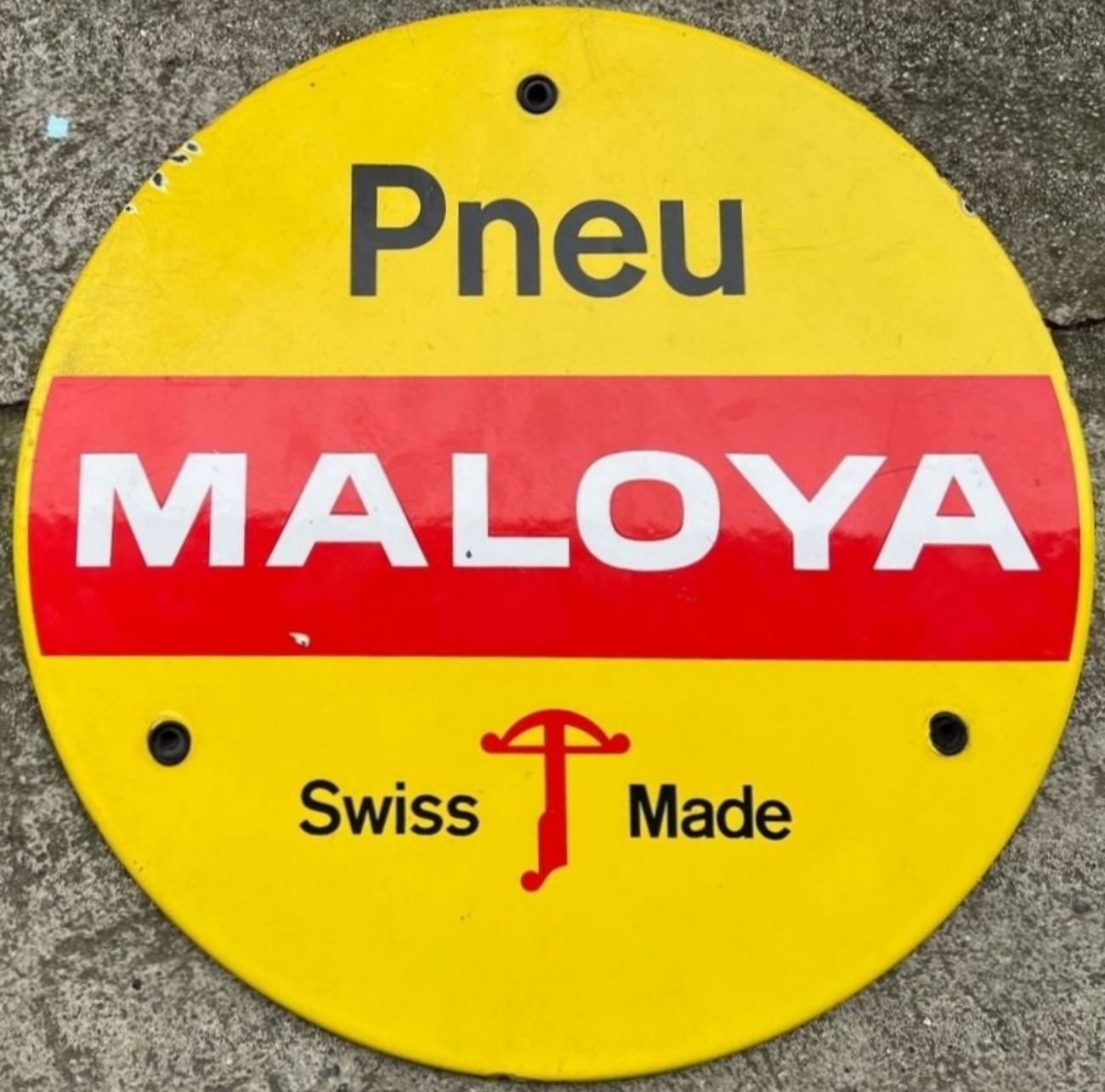 Maloya Pneu Swiss Emailschild aus der Schweiz, ca. aus den 80er Jahren, Durchmesser: 35cm.