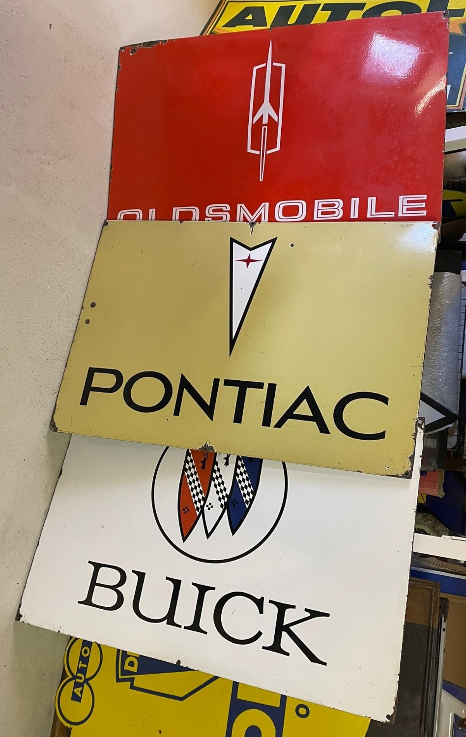GM Oldsmobile Pontiac und Buick Emailschilder aus der Schweiz, ca. aus den 60er Jahren, Masse: 65 x 100cm.